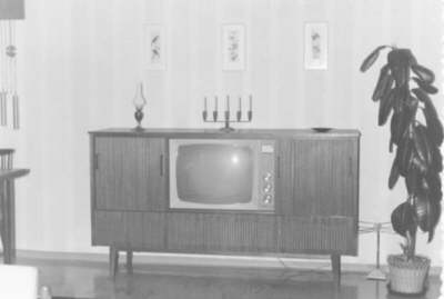 Dies war unsere Musiktruhe. Links oben war ein Radio drin, rechts ein Plattenspieler und rechts neben dem Fernseher war unser Tonbandgerät. Die Truhe habe ich später im Zwergerweg in mein Zimmer bekommen. Das war damals eine Schufterei sie über die engen Treppen bis in den zweiten Stock zu bekommen.