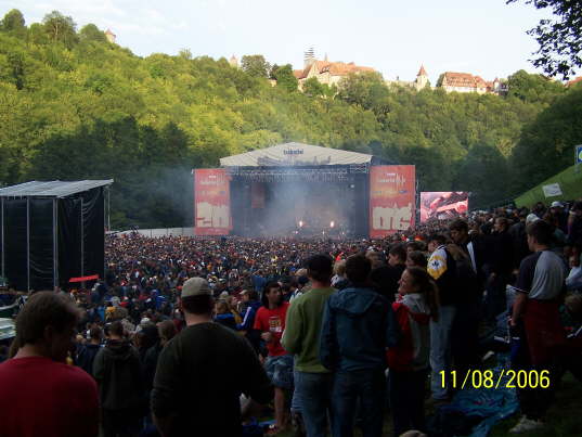 Die Sonne ist da! So ist es schön am Taubertal-Openair...unten die Bühne mit vielen Fans und oben strahlt Rothenburg im Sonnenlicht!