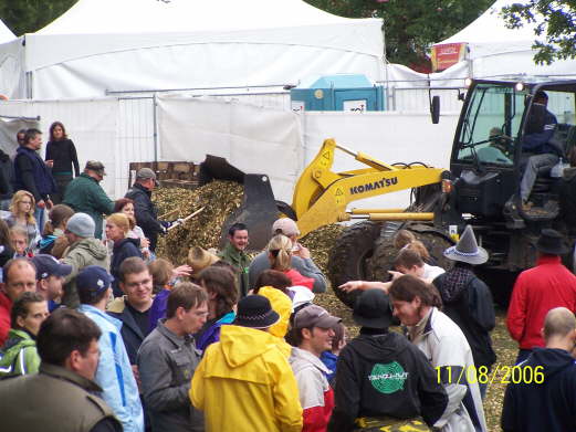 Der Veranstalter hat das Problem mit dem Schlamm erkannt und begann schon am Freitag, während sich der Platz füllte, gegen zu steuern. Mit Radladern wurden grobe Fichtenholzspäne auf den Platz verteilt.