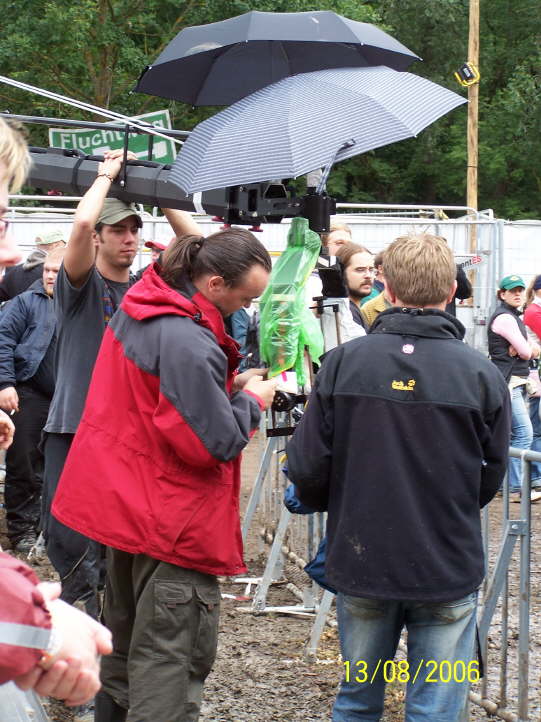 Der WDR bereitet sich auf die Aufzeichnung vor. Der Kameramann (rote Jacke) bereitet die Montage der ferngesteuerten Kamera am Kran vor.