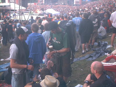 Diese Leute haben wohl einen der schwersten Jobs... Der Bierbringservice mit 30 l Bier auf dem Rücken auf dem rutschigen Berg zwischen den Besuchern und ja nicht stolpern.... Ich vermute das sie im Vergleich zu den letzten Jahren kein gutes Geschäft gemacht haben. Wenn es drei Tage Sonnenschein von morgends bis abends gibt, geht da sicher einiges mehr weg!